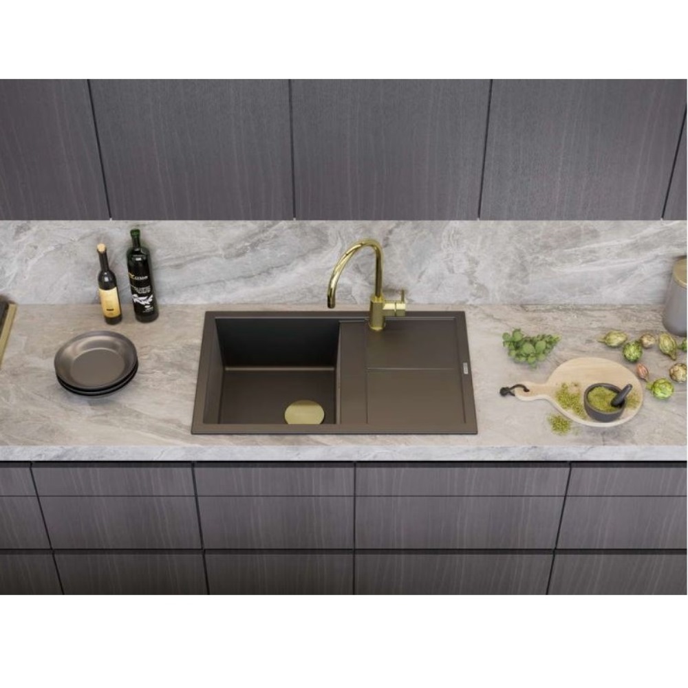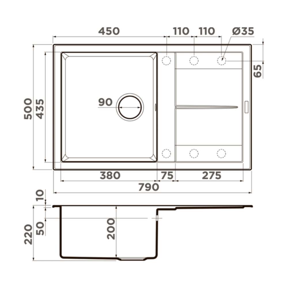 Мойка кухонная Omoikiri из коллекции Sumi 79-BL имеет размеры 790х500 мм., изготовлена из искусственного гранита. Форма — прямоугольная, одна чаша без отверстия для смесителя. Сифон в комплекте. Ширина чаши 38. Врезной монтаж. Имеется крыло.
