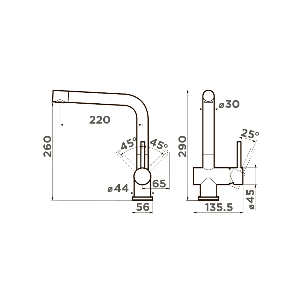 Смеситель для кухни Omoikiri Koriyama оснащен рычажным управлением для регулировки температуры и напора воды. Горизонтальный монтаж на 1 отверстие. Поворотный излив 220 мм.