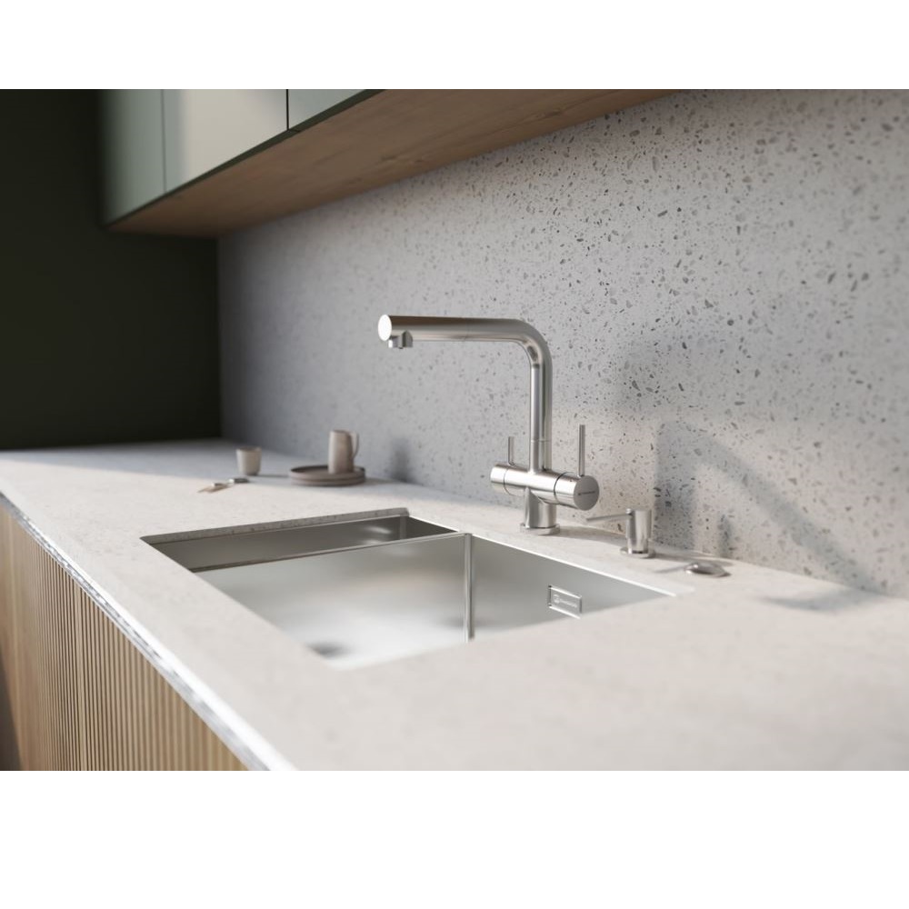 Смеситель для кухни Omoikiri Takamatsu-S с подключением фильтра и выдвижной излив оснащен рычажным управлением для регулировки температуры и напора воды. Горизонтальный монтаж на 1 отверстие. Поворотный излив 198 мм.