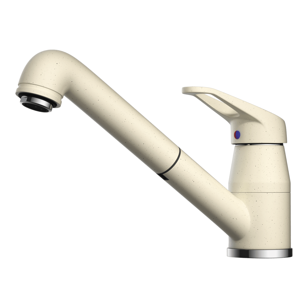 Смеситель для кухни Omoikiri Tateyama-S оснащен рычажным управлением для регулировки температуры и напора воды. Горизонтальный монтаж на 1 отверстие. Вытяжной излив 258 мм.