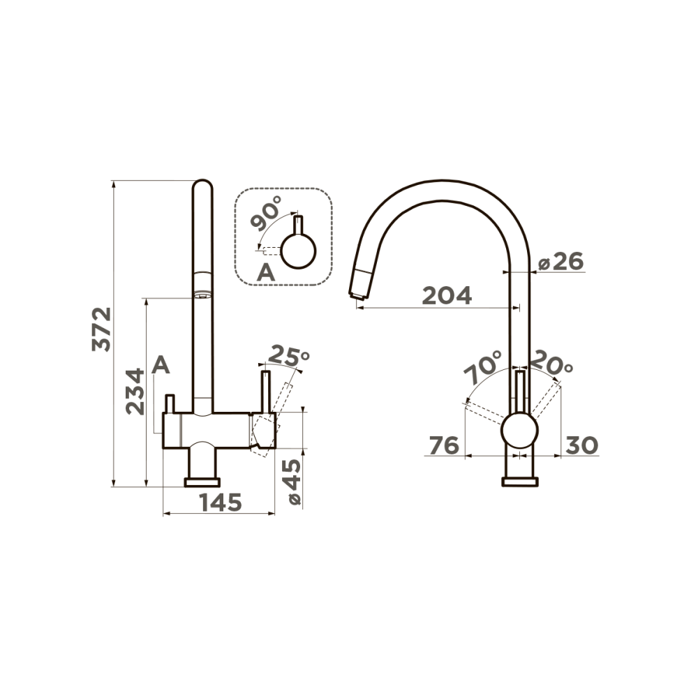 Смеситель для кухни Omoikiri Yamada-P с подключением фильтра оснащен рычажным управлением для регулировки температуры и напора воды. Горизонтальный монтаж на 1 отверстие. Поворотный излив 204 мм.