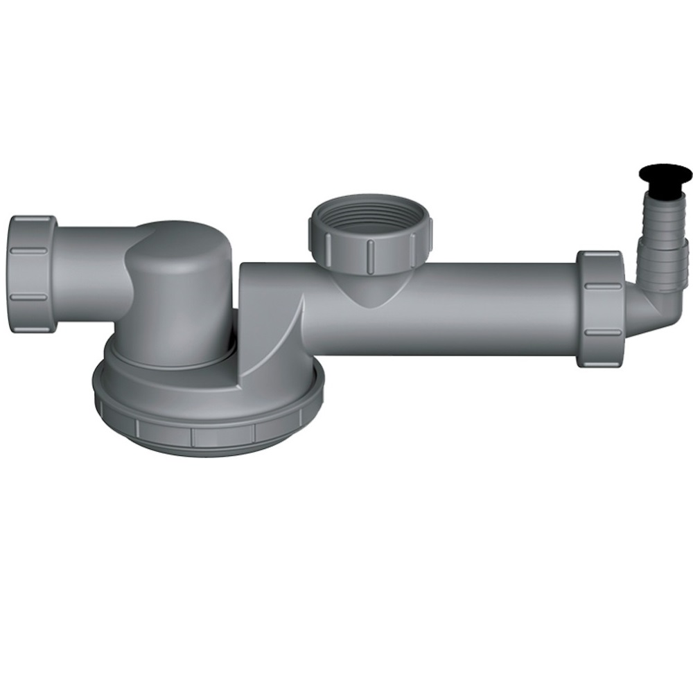 Компактный сифон с гидрозатвором и дополнительным выходом для стиральной машины или посудомоечной машины подходит для одночашевых моек.